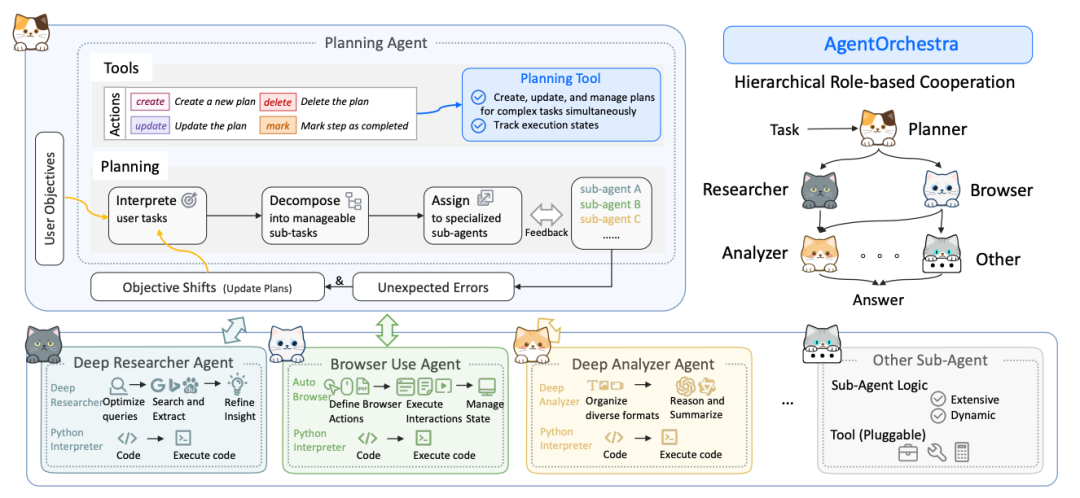 顾名思义,AgentOrchestra 就像是一支由各类智能体组成的“AI交响乐团”:每个智能体都是独当一面的“乐手”,由顶层“指挥”智能体统筹规划,分工协作,各展所长。