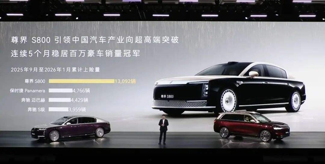 另一款旗舰尊界 S800 也有着同样强劲的销量,它在高端市场同样越过了几款传统豪华巨头的同期销量总和。用余承东在台上的原话来形容,S800 同样做到了「一打三」。