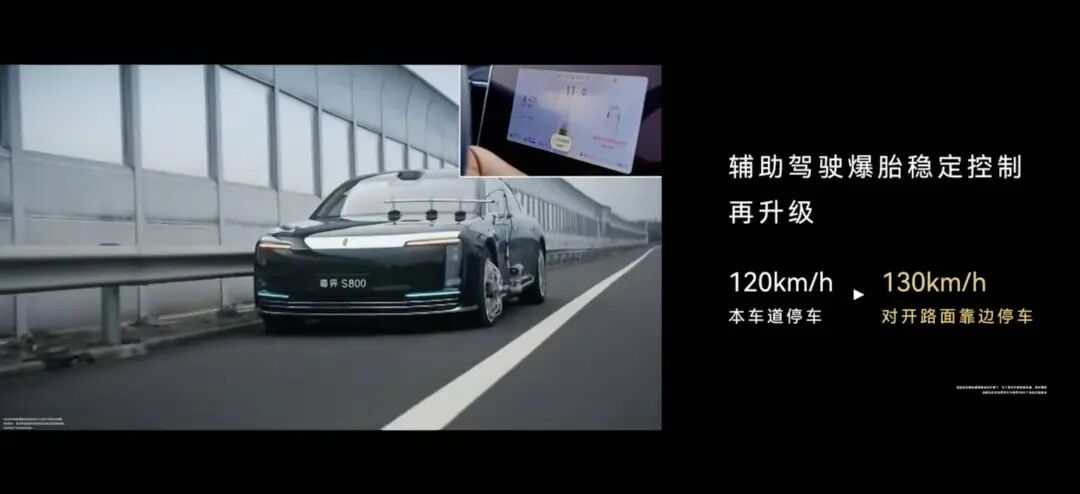 爆胎稳定控制的介入速度上限,从 120km/h 提升到了 130km/h。系统在稳住车身姿态后,不再像以前那样直接在当前车道把车刹停,它会自动寻找安全的时机靠边停车,大幅降低了二次事故的风险。