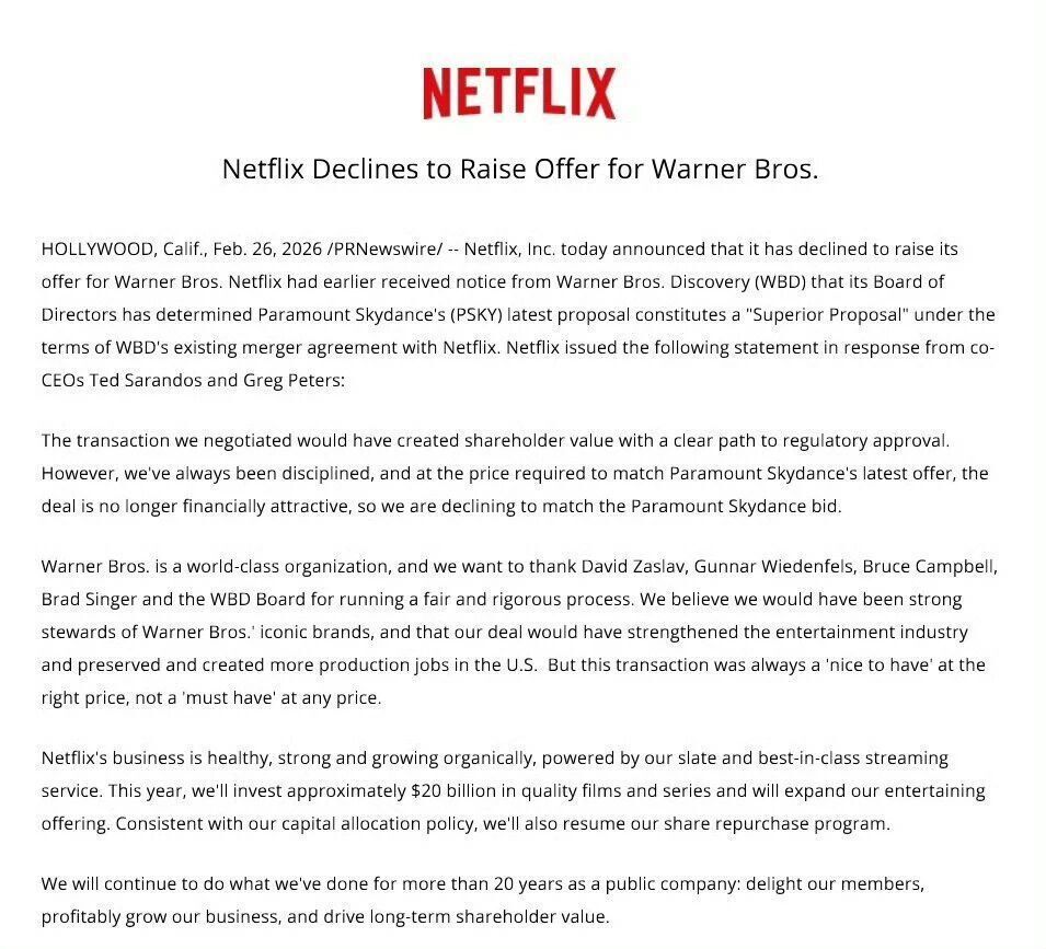 2026年2月26日,美国流媒体巨头网飞在官网发布声明,正式宣布放弃对华纳兄弟探索公司的收购计划。