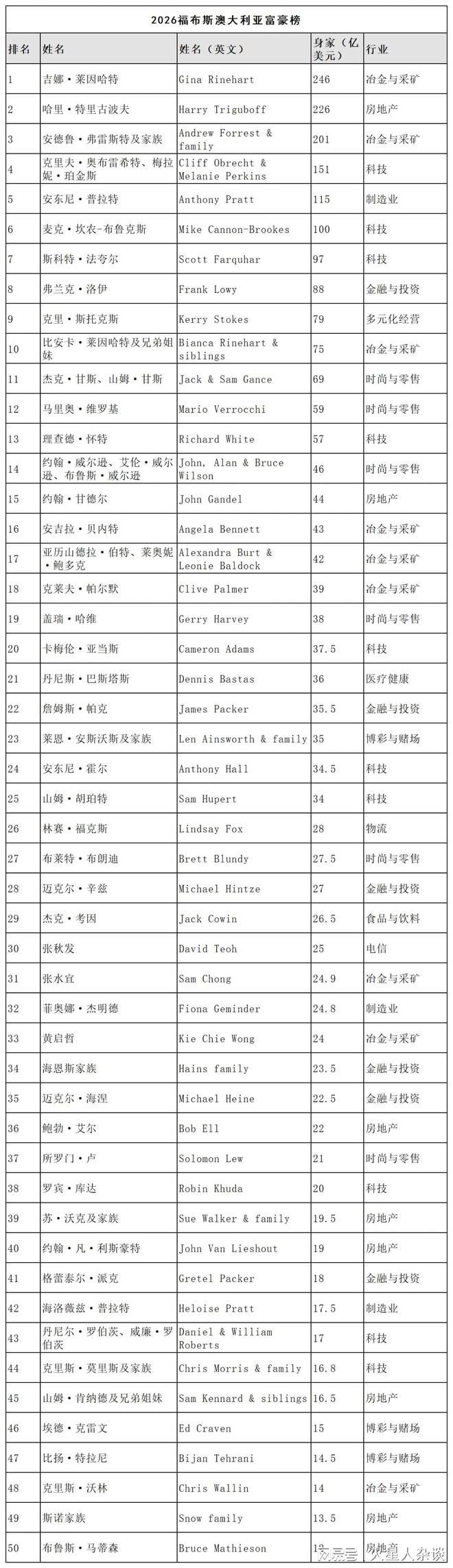 根据福布斯发布的2026澳大利亚富豪榜显示,50位上榜者的总财富达到2540亿美元(约合人民币1.74万亿元),较去年增加了4.5%(110亿美元)。入围门槛从去年的9.75亿美元提升至12亿美元。