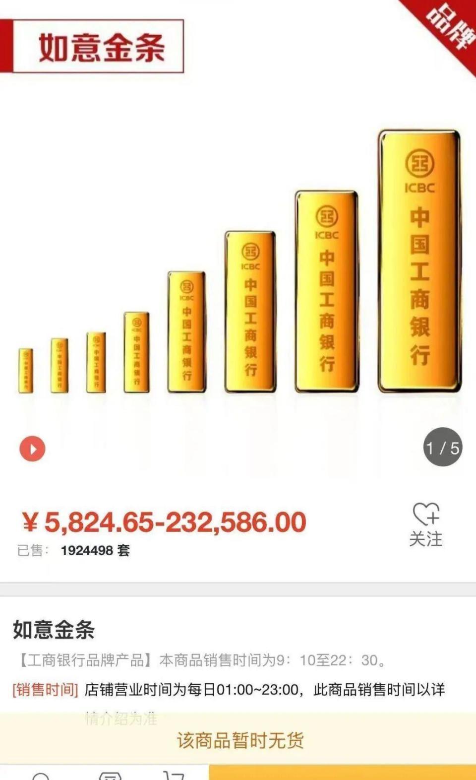 这可不是什么营销噱头。 记者实地探访发现,工行、农行、建行这些国有大行,APP上的金条购买页面清一色显示“暂时无货”或“已售完”。 就算你在网点下了单,也得等上一周甚至更久,由金库统一配送,现货根本见不着影。